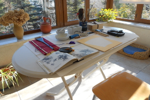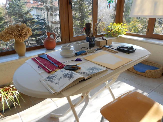 During my studies of Nihonga (Japanese painting), I was very much impressed by Japanese artists' capacity to express the beauty of simplicity, their respect for nature and inspiration by even a most humble wild flower or plant. I have quickly adopted this manner of simplicity and the search of perfectionism in details. As Japanese art material, I use material such as gold and silver paints, gold flakes, plates, powder which were also used in my very own traditional art, "Turkish Miniatures". The material I use also includes Japanese rice and silk paper, stone ink, Japanese natural colouring similar to guache, gold flakes and a special glue made of seaweed to hold gold plating and recently, oil paint on canvas or more rarely, on press-toile. With these tools and philosophy, I am trying to reflect the beauty of the wide-open spaces of Central Anatolia and the view from the windows of our house in Ankara. My recent choice of oil paint is to avoid using glass framing, as oils need less protection than the more fragile paper.